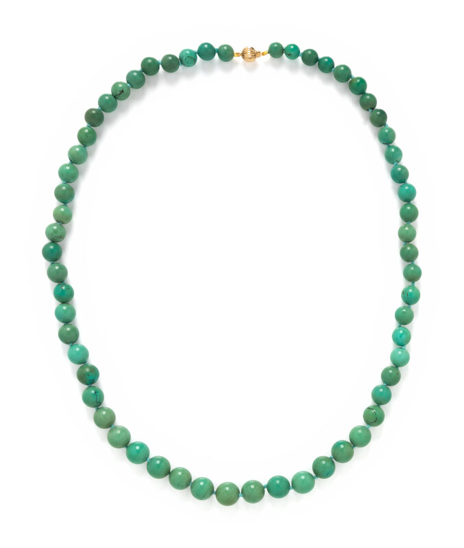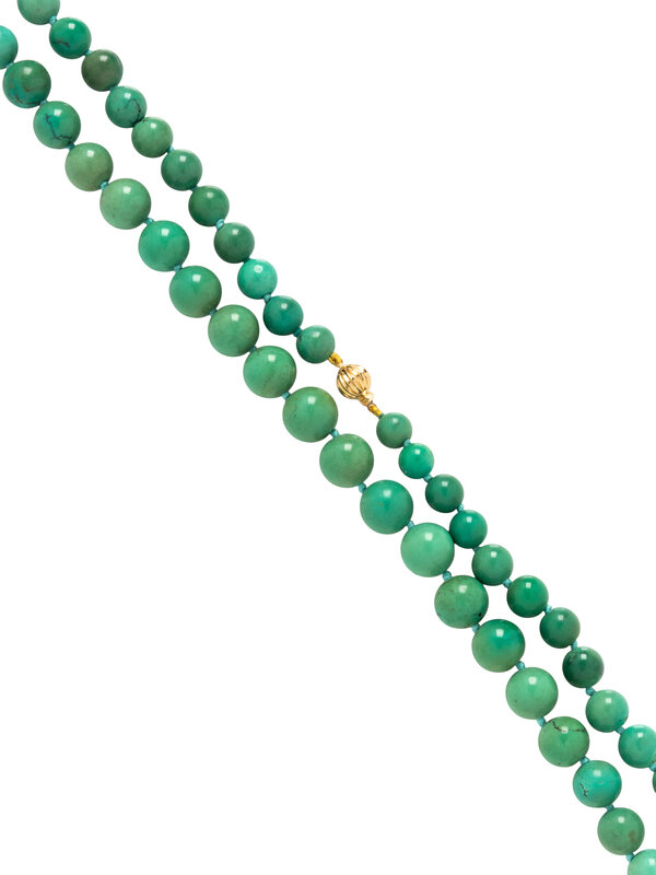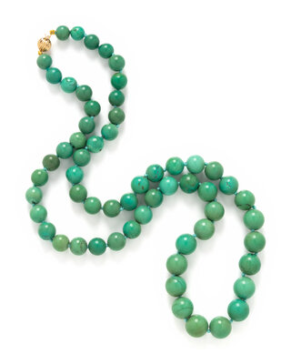 Turquoise beads measuring approximately 8.50 - 13.00 mm, with a 14 karat yellow gold clasp. 27 1/2 inches long.