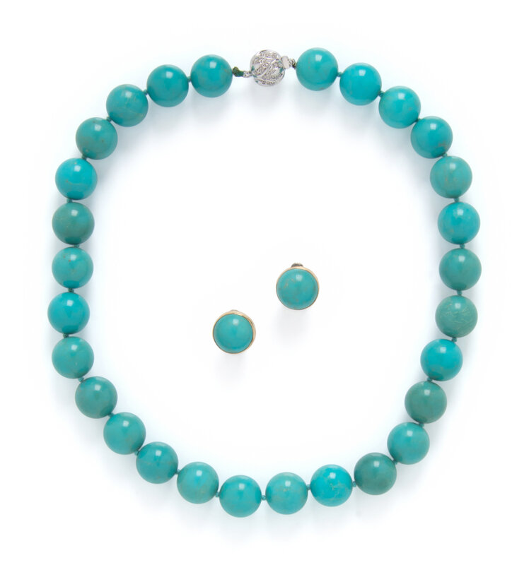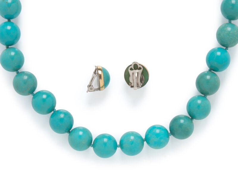 Including a pair of earrings set with round cabochon turquoise measuring approximately 13.75 mm, and a turquoise necklace with round beads measuring approximately 14.20 mm, with a diamond-set 14 karat white gold clasp. Earrings: 9/16 inch wide. Necklace: 17 1/2 inches long.