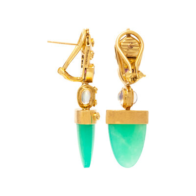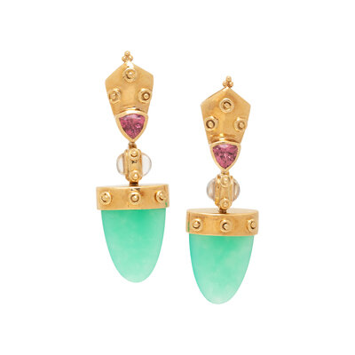 YELLOW GOLD, CHRYSOPRASE, MOONSTONE, AND PINK TOURMALINE DROP EARRINGS