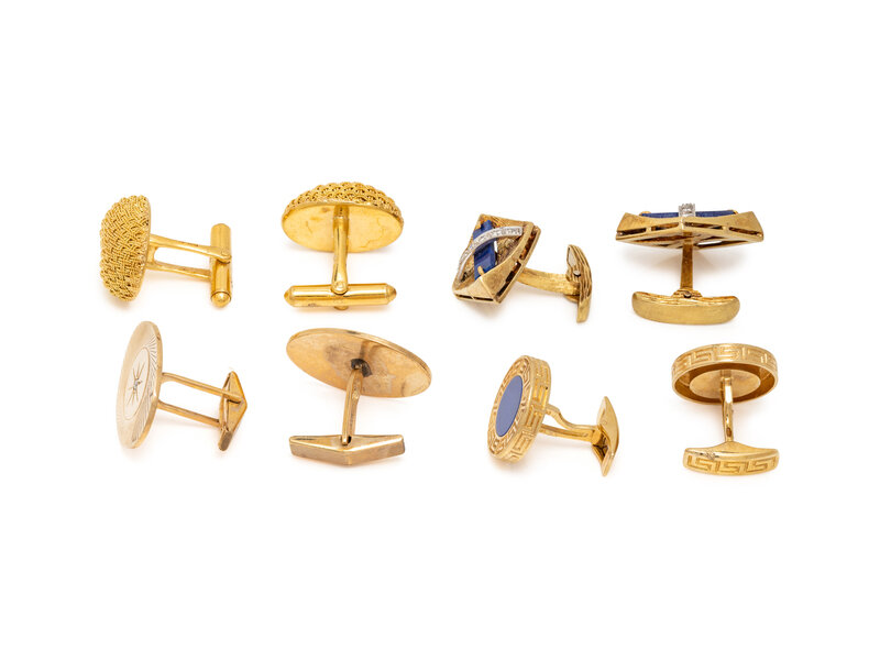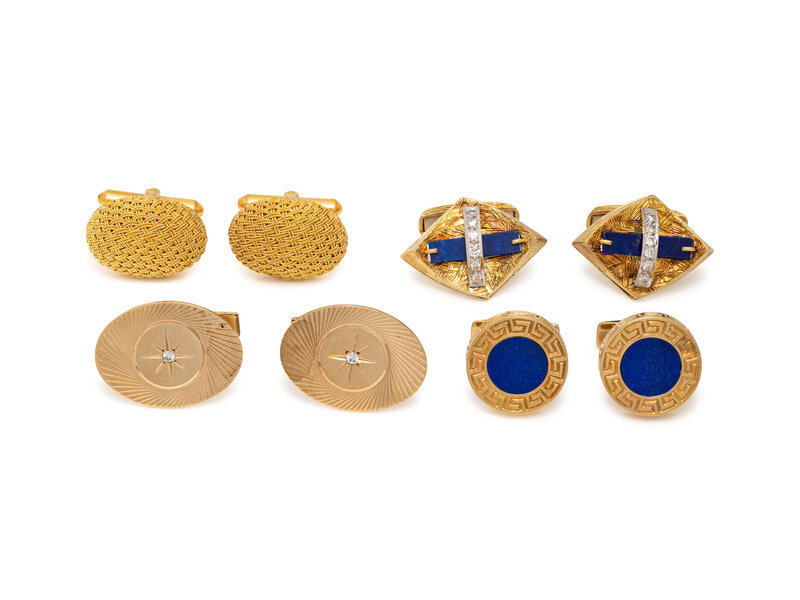 Four sets of cufflinks, one set with lapis lazuli, one set with lapis lazuli and round diamonds, one set with round diamonds, and one in a woven gold motif. Yellow gold. 5/8 inch wide, 1 1/8 inches x 3/4 inch, 1 x 3/4 inch, and 7/8 x 5/8 inch.