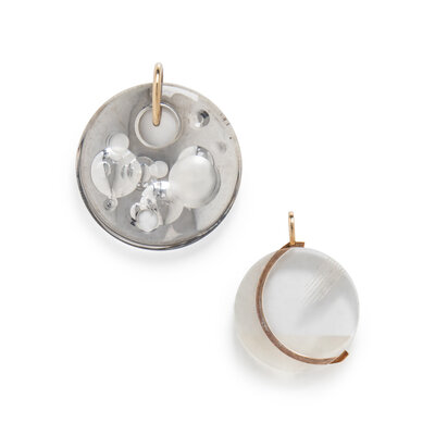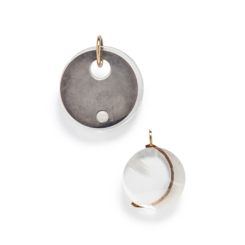 One 'Moons of Jupiter' pendant and one 'Moondream' pendant. 14 karat yellow gold and sterling silver. 2 1/2 inches long and 2 1/8 inches long.