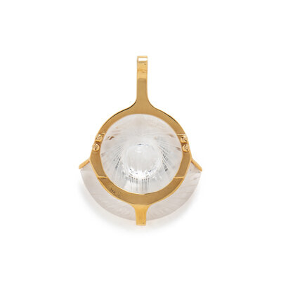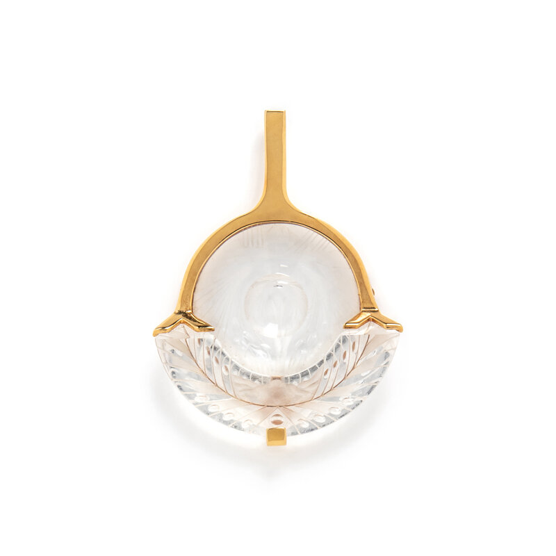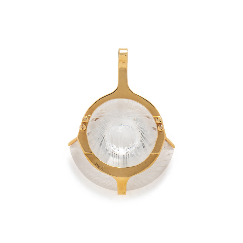Carved glass. 18 karat yellow gold. 2 1/2 x 2 inches.
