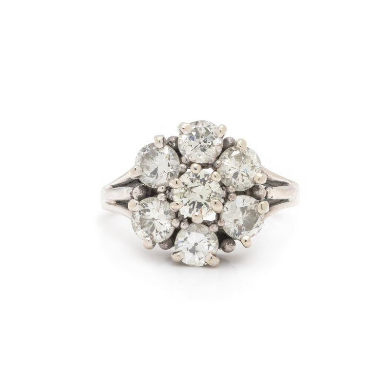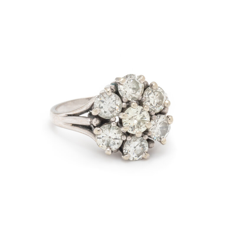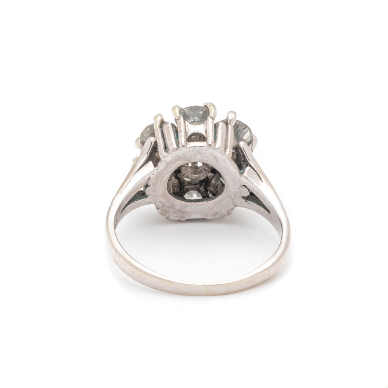 Transitional cut diamonds weighing approximately 2.30 carats total. 14 karat white gold. Ring size 7 1/4.