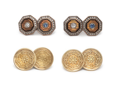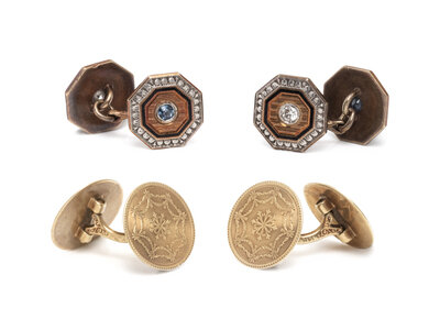 Two pairs of cufflinks, one set with round transitional cut diamonds, round synthetic sapphires, and black enamel. Yellow and white gold. 13.00-14.00 mm wide.