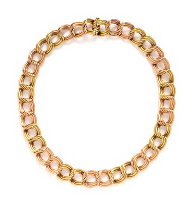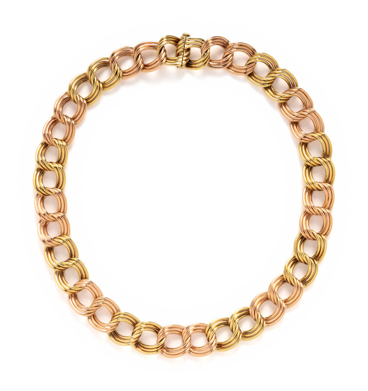 Yellow and rose gold. 17 inches long, 5/8 inch wide.