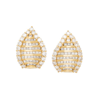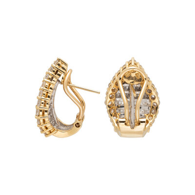 Carre cut and round diamonds weighing approximately 3.75 carats total. 18 karat yellow gold. 1 inch x 5/8 inch.