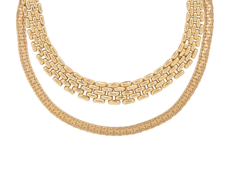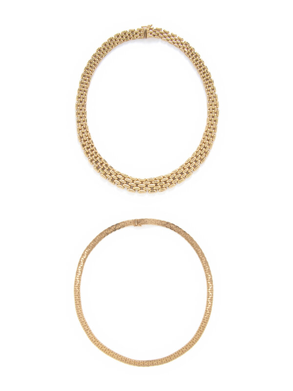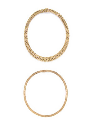 One with textured fancy links measuring approximately 6.00 mm wide, the other with graduating brick links measuring approximately 9.00 - 14.00 mm wide. 14 karat yellow gold. 16 inches and 17 inches long.