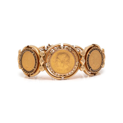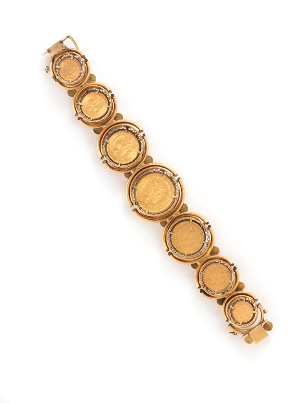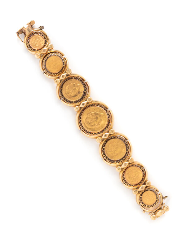 Seven Mexican pesos coins from 1945 - 1959. Mounted in 18 karat yellow gold. 7 1/2 inches long.