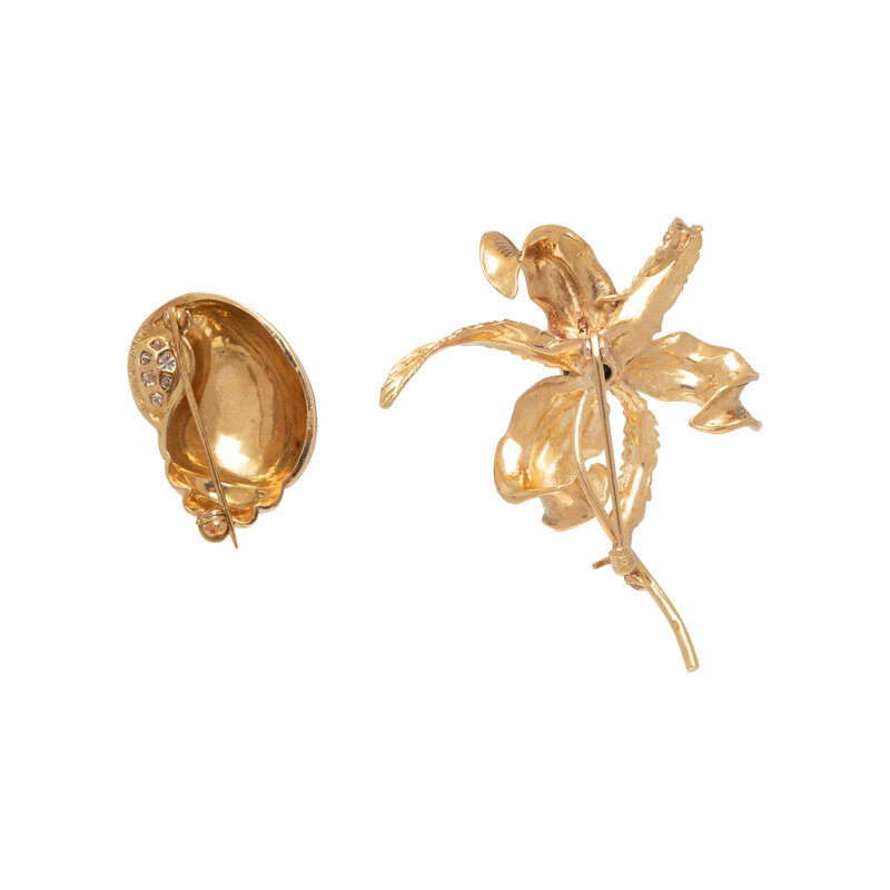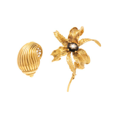 Two brooches, one flower motif set with an oval cabochon black sapphire, and one shell motif set with round diamonds. 18 karat yellow gold. 2 x 1 3/4 inches and 1 x 7/8 inch.