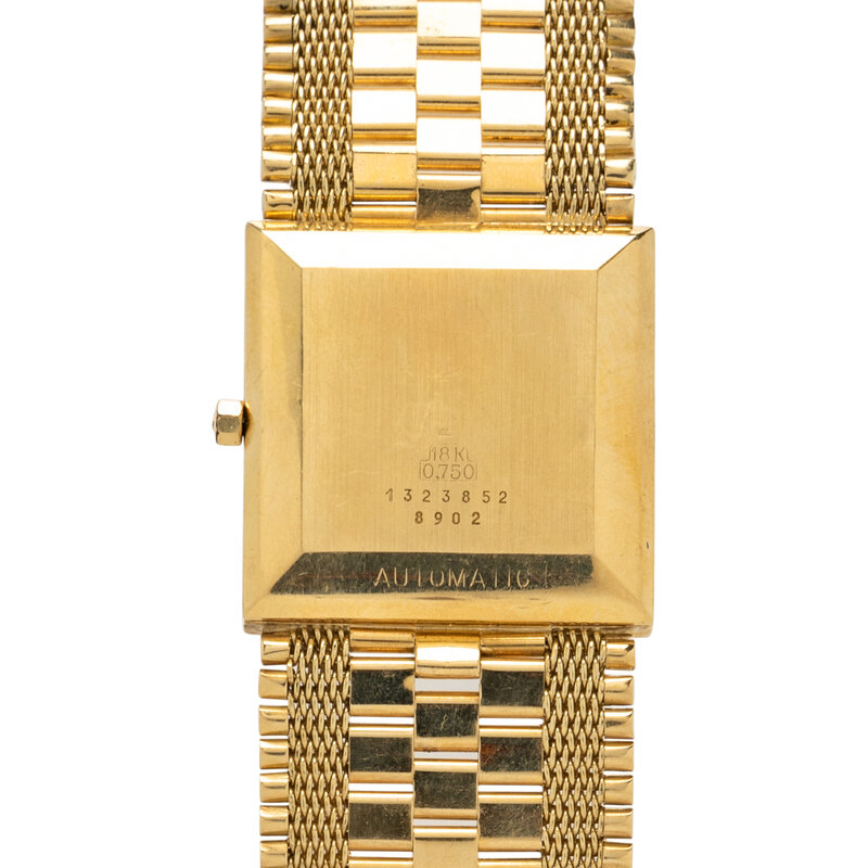 Stamps: Case back: 18K 0.750 1323852 8902 MACHO AUTOMATIC. Clasp stamp: PRB 18K TM.