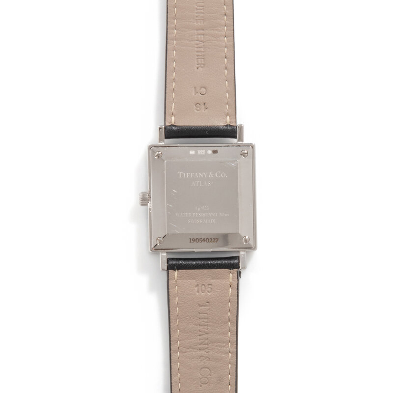 Stamps: Case back: 925 (Swiss hallmarks) ES TIFFANY & Co. ATLAS Ag925 WATER RESISTANT 30m SWISS MADE 190540227. Buckle: TIFFANY & Co. Ag925 (Swiss hallmarks).