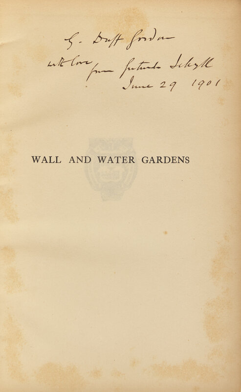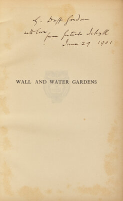 (London): Country Life, (1901). First edition, presentation copy, inscribed on half-title "G. Duff Gordon with love from Gertrude Jekyll June 29 1901." 4to. 177 pp. Blue-green cloth, stamped in gilt, boards soiled and extremities worn, front joint starting; prelims foxed; scattered light foxing.