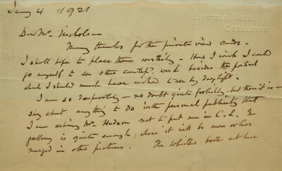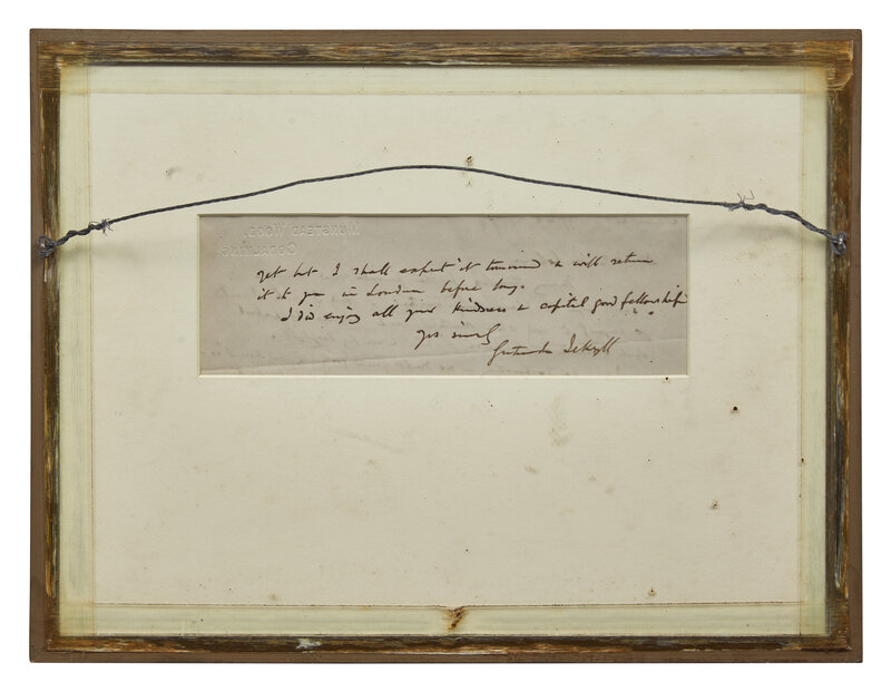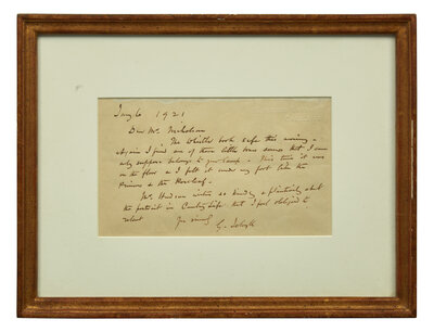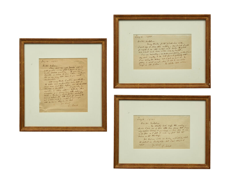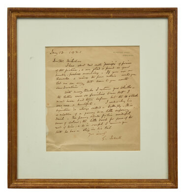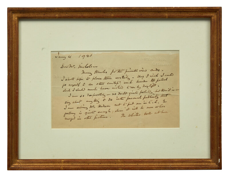 1. Munstead Wood, January 4, 1921. One sheet, two pages. 4 3/4 x 7 3/4 in. (121 x 197 mm) (sight). "Dear Mr. Nicholson, Many thanks for the private view cards - I shall hope to place them within- How I wish I could go myself to see others context... work besides the portrait which I should much have wished to see by daylight. I am so desperately- no doubt quite foolishly- but there it is-shy about anything to do with personal publicity that I am asking Mr. Hudson not to put me in C.L. The gallery is quite enough, where it will be more when merged in other pictures. The Whistlers book out here get but I shall expect it tomorrow & will return it to you in London before long. I did enjoy all your kindness & capital good fellowship. Yrs. sincerely, Gertrude Jekyll." Creasing from old folds. In mat and in frame, 10 x 13 in. (254 x 330 mm.) Unexamined out of frame.