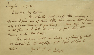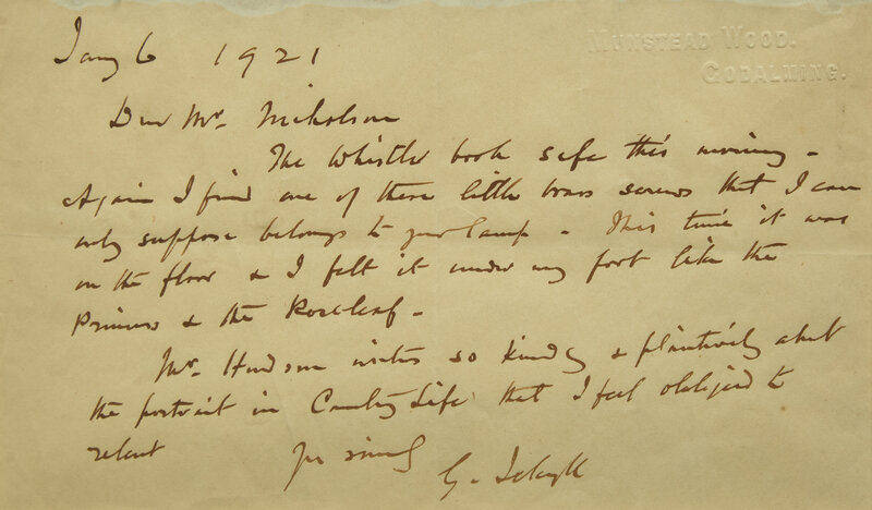 2. Munstead Wood, January 6, 1921. One sheet, 4 1/2 x 7 1/2 in. (114 x 190 mm.) "Dear Mr. Nicholson, The Whistlers book safe this morning- Again I find one of these little brass screws that I can only suppose belongs to your lamp. This time it was on the floor, & I felt it under my foot like... the Roseleaf- Mr. Hudson wishes so kindly and privately about the portrait in Country Life, that I feel obliged to relent. Yrs Sincerely G. Jekyll." White stain along top margin; creasing from old folds; in mat and in frame, 9 3/4 x 13 in. (248 x 330 mm.) Unexamined out of frame.