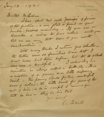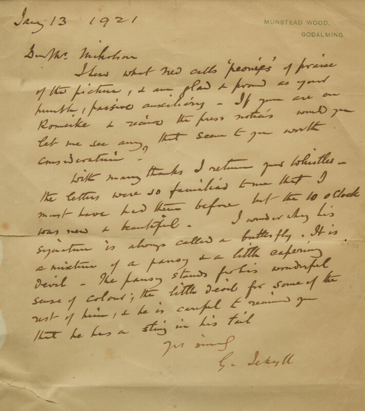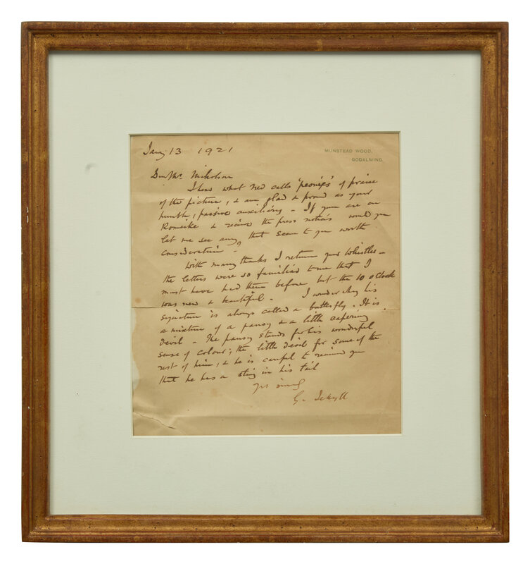 3. Munstead Wood, January 13, 1921. One sheet, 7 1/4 x 6 1/4 in. (184 x 159 mm). "Dear Mr. Nicholson, I send what Ned calls 'peonies' of praise of the picture. & am glad & proud, as your humble, passive auxiliary- If you... receive the press notices would you let me see any, that seem to you worth consideration? With many thanks I return your Whistler- the letters were so familiar to me that I must have had them before, but the 10 o'clock was new and beautiful. I wonder why his signature is always called a butterfly. It is a mixture of a pansy and a little... devil. The pansy stands for his wonderful sense of colour; the little devil for some of the rest of him, and he is careful to remind you that he has a sting in his tail. Yrs Sincerely, G. Jekyll." Creasing from old folds, white stains to left margin, in mat and in frame, 12 1/2 x 11 1/2 in. Unexamined out of frame. (318 x 292 mm).