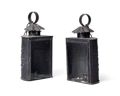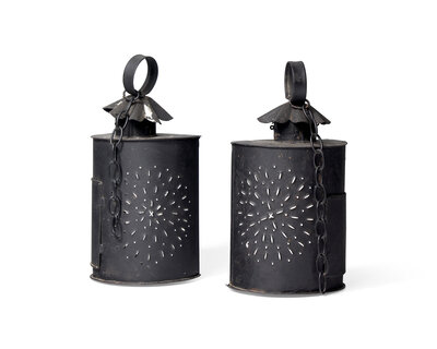 A Pair of Hanging Pierced Tinware and Glass Lanterns