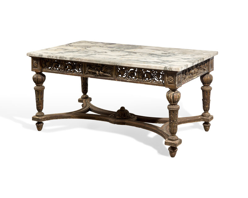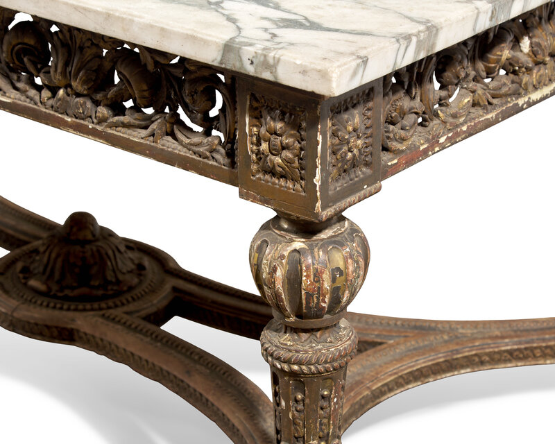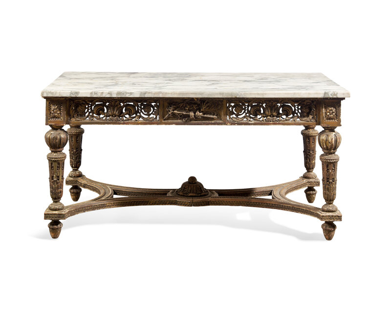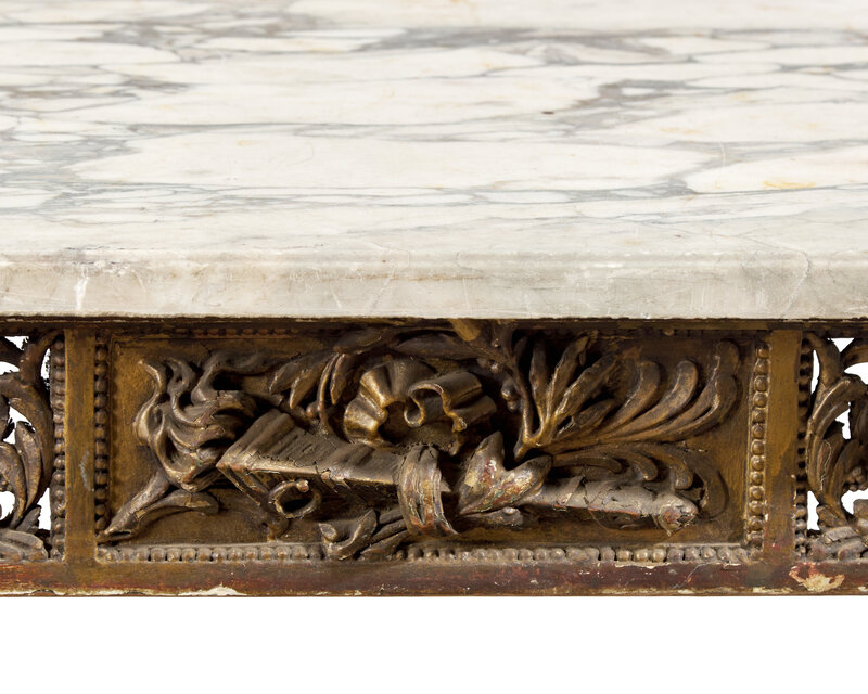 A Louis XVI Style Carved and Giltwood Center Table with Breccia Capraia Marble Top