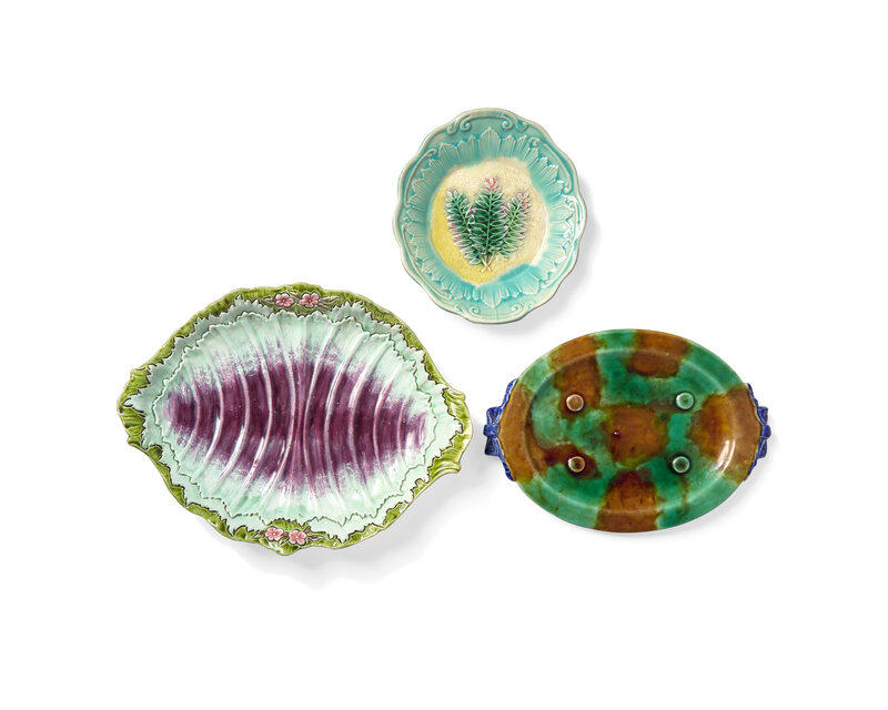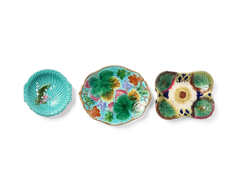 the majority apparently unmarked, but including a dish by Wedgwood, date code for 1875, with impressed "Wedgwood" mark and date code, "HID"; a dish by Julius Dressler, Biela bei Bodenbach, Austria, 1910-1918, the underside with stamped mark, impressed "Austria" and "4607", and inscribed, "544/ 32"; and a "Lily of the Valley" dish and covered sugar dish, the dish marked, "Cico/ Germany/ Hand Painted" and with impressed numerals, "4583."