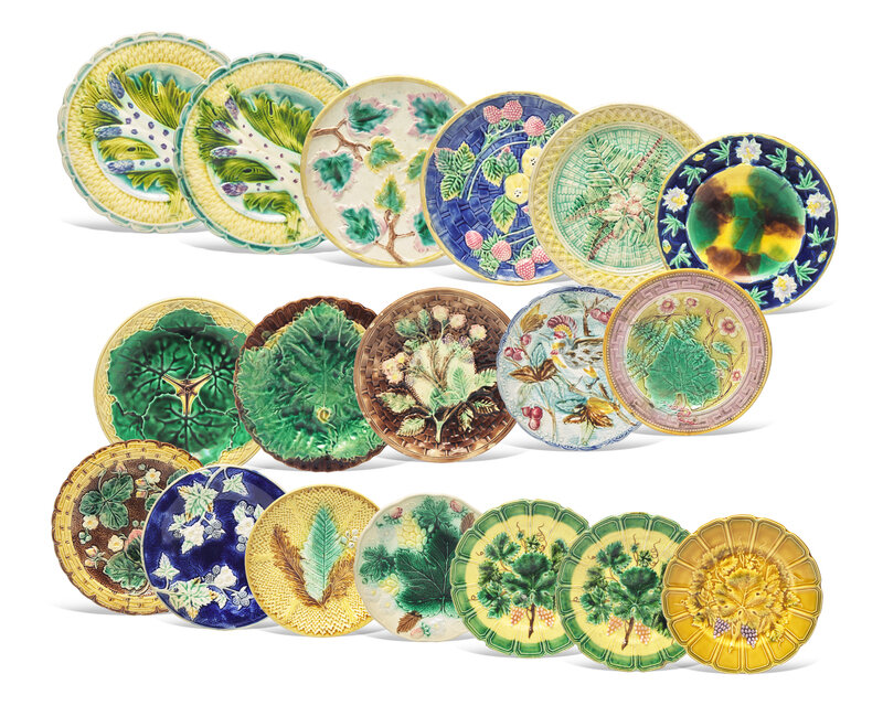 including one marked to underside, "Made in France/ PV"; a pair of plates, by Sarreguemines marked to underside with impressed "Sarreguemines" and stamped mark, "Made in Germany"; two plates by Griffen, Smith and Hill (1880-1889), Phoenixville, Pennsylvania, circa 1885, with impressed "GSH" cipher and "Etruscan Majolica" mark; and a plate by Wedgwood, with impressed "Wedgwood" mark and impressed code, as well as a stamped "Wedgwood/ Etruria-England" mark; and other plates bearing various impressed or inscribed numerals or digits.