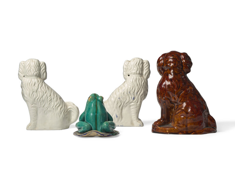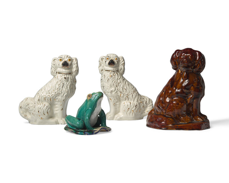 comprising a pair of Staffordshire gilt and enamel-decorated spaniels, a Rockingham-glazed spaniel, and a glazed stoneware frog, with an indistinct incised signature to underside.