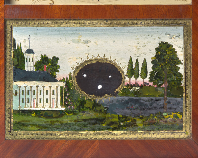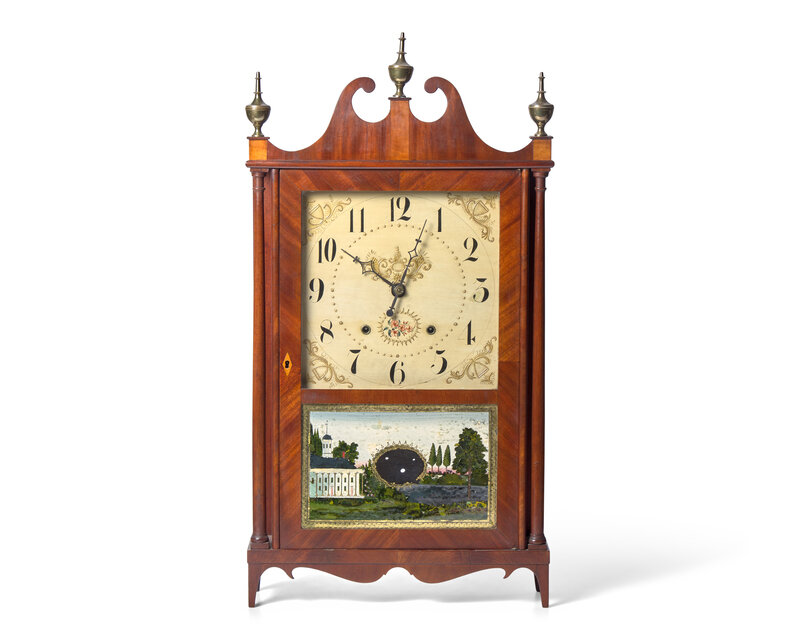 with broken arch pediment, surmounted by three brass finials, enamel-decorated face, the spandrels with patriotic shields, the door with eglomise panel depicting a landscape with Classical house, two colonnettes, on shaped apron with feet, the interior retaining original Eli Terry label; accompanied by a modern wood shelf.