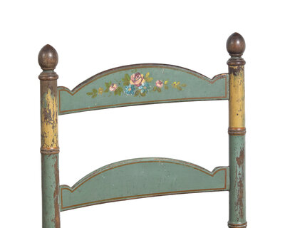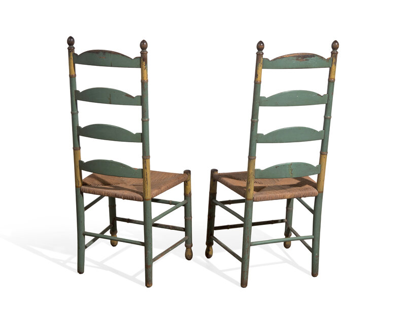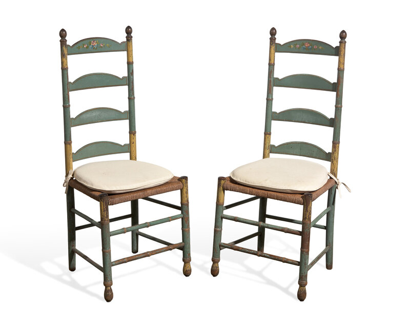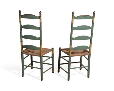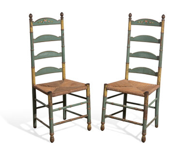 A Pair of Green-Painted and Decorated Ladder-Back Rush-Seat Side Chairs