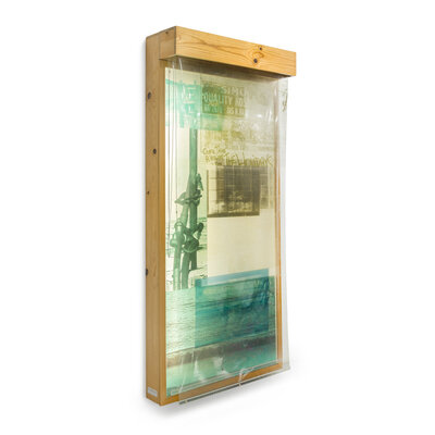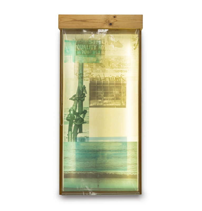 lithograph and assemblage with a sailcloth, Mylar, a wooden lightbox, a fluorescent light fixture, aluminum, a moveable window shade system, and Plexiglas bars