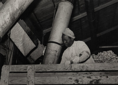 Taking the cotton from the truck into the gin through large metal suction tube. Hopson Plantation. Clarksdale, Miss, 1939