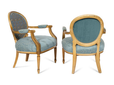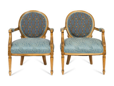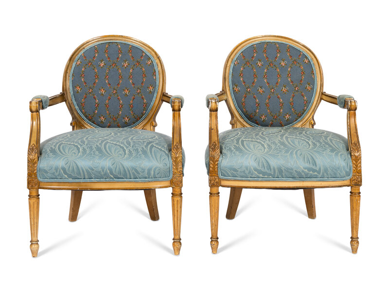 A Pair of Louis XVI Style Cream-Painted and Parcel Gilt Fauteuils with Needlepoint Backs