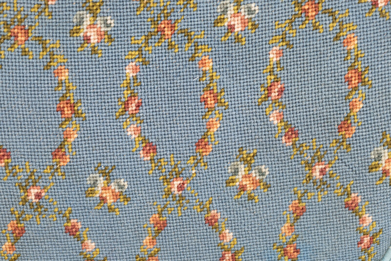 The seats and arms with blue fabric upholstery.