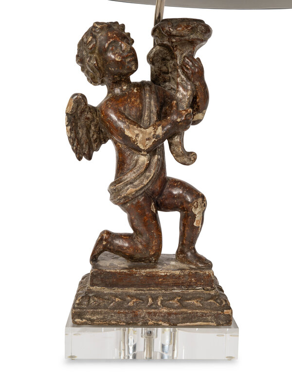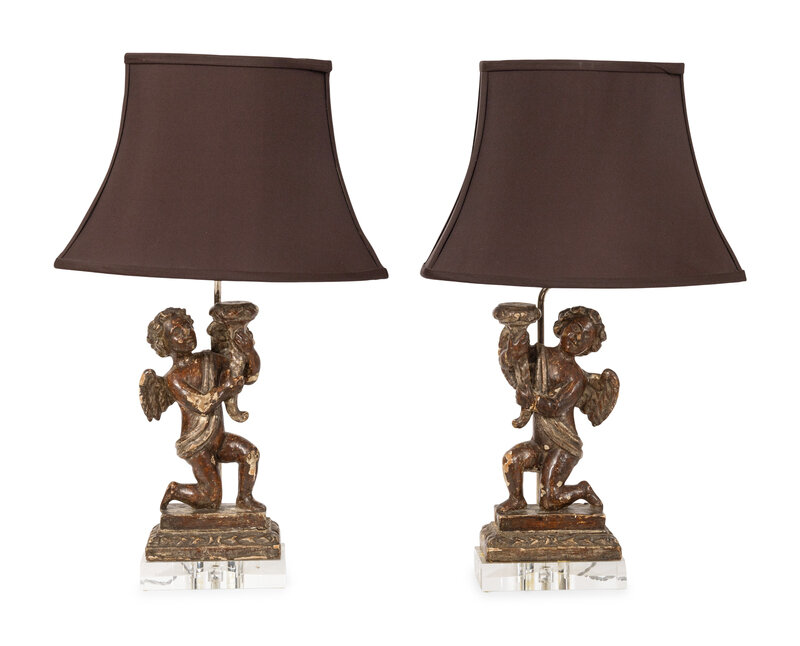 mounted with giltwood cherubs, with black square corner bell-form silk shades.