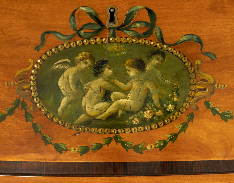 Each top decorated with a painted medallion of a lady amidst flowers inside a medallion, ribbons, acanthus, and a floral border, the drawers and case painted with motifs including floral swags, masks, and medallions.