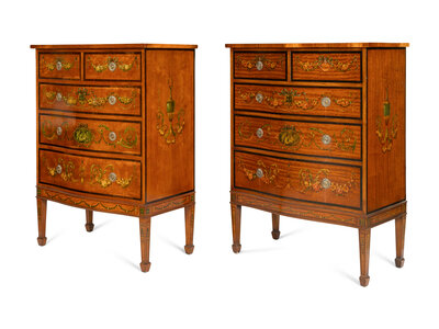 A Pair of Edwardian Paint-Decorated Satinwood Five-Drawer Chests