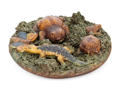 Three dishes molded with sea creatures and amphibians, the largest diameter 8 inches.