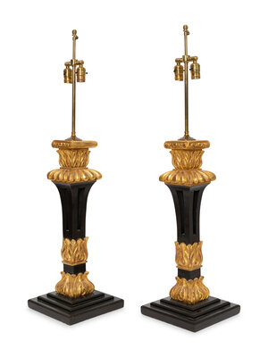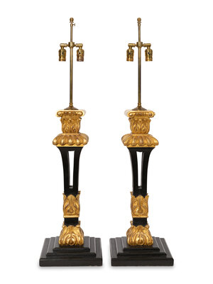 A Pair of Victorian Black-Painted and Parcel Gilt Table Lamps