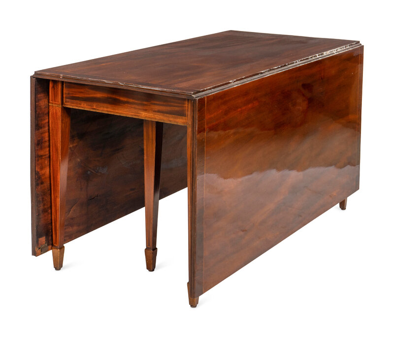Made up of 3 gate-leg sections and retaining two additional 26-inch solid mahogany leaves.