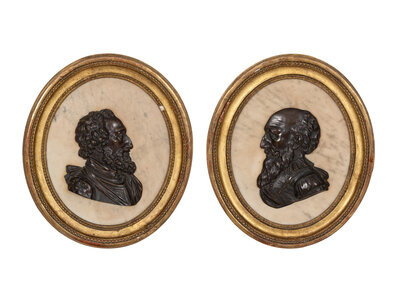 Mounted on marble plaques set in oval giltwood frames. Having been de-accessed from the collection of a Parisian hotel decorated by Maison Jansen.