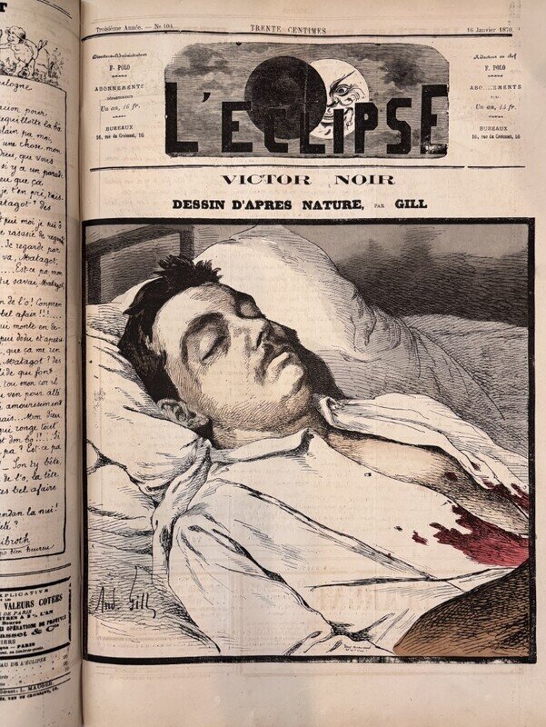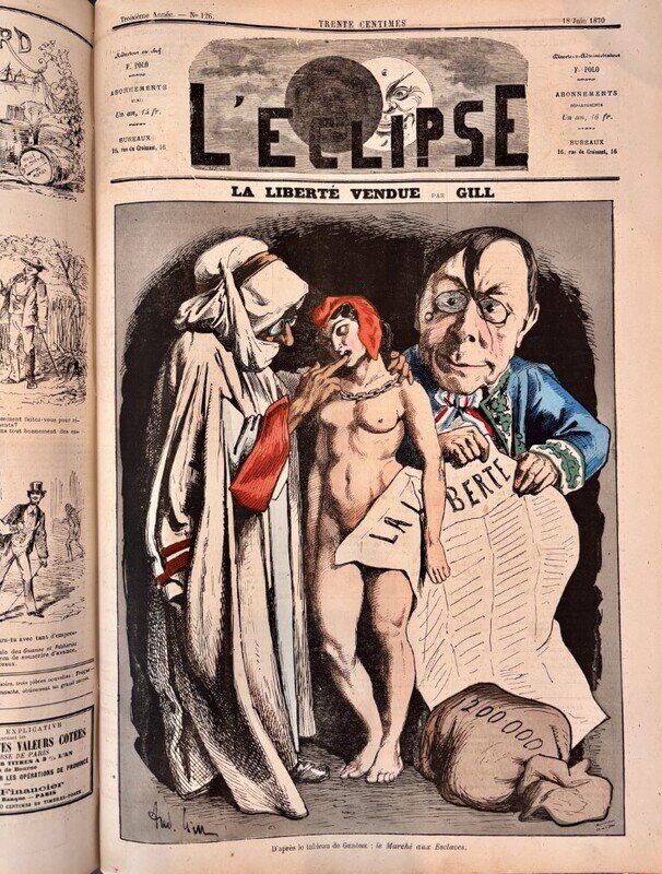 Comprising a nearly complete group of 399 issues of the French satirical newspaper bound in three folios, from the first (January 26, 1868) to the the last (June 25, 1876) (lacking one issue: no. 137, September 4 1870).