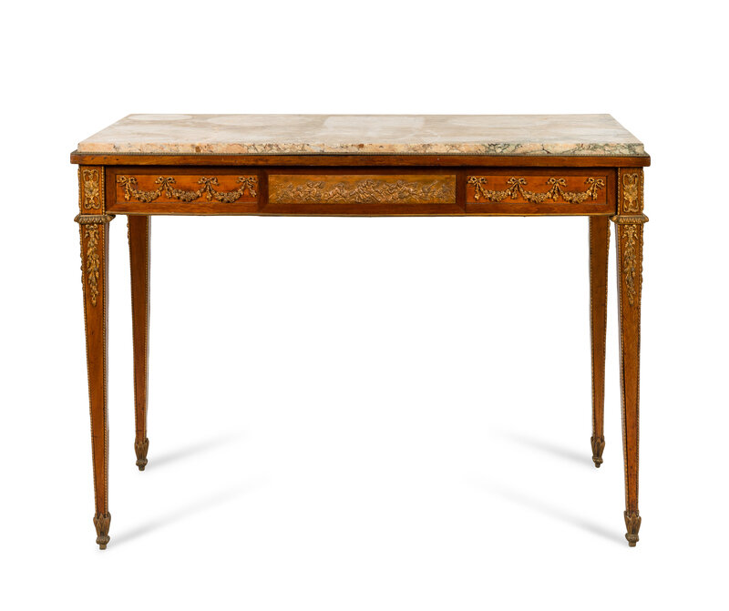 A Louis XVI Style Gilt Bronze Mounted Mahogany Center Table with Inset Frieze and Marble Top