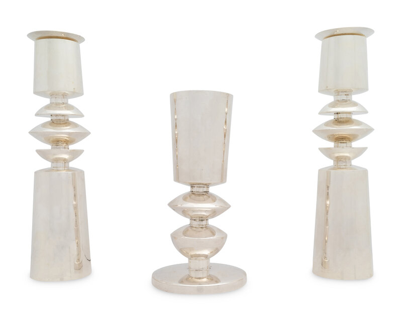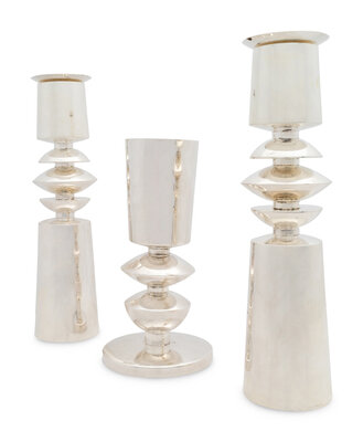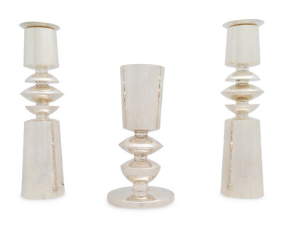 A Carmel Shabi Modernist Silver Kiddish Cup and Pair of Shabbat Candlesticks