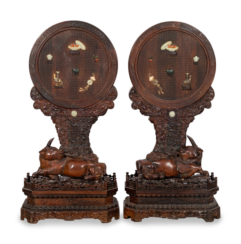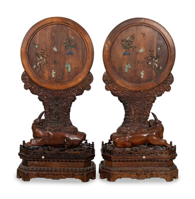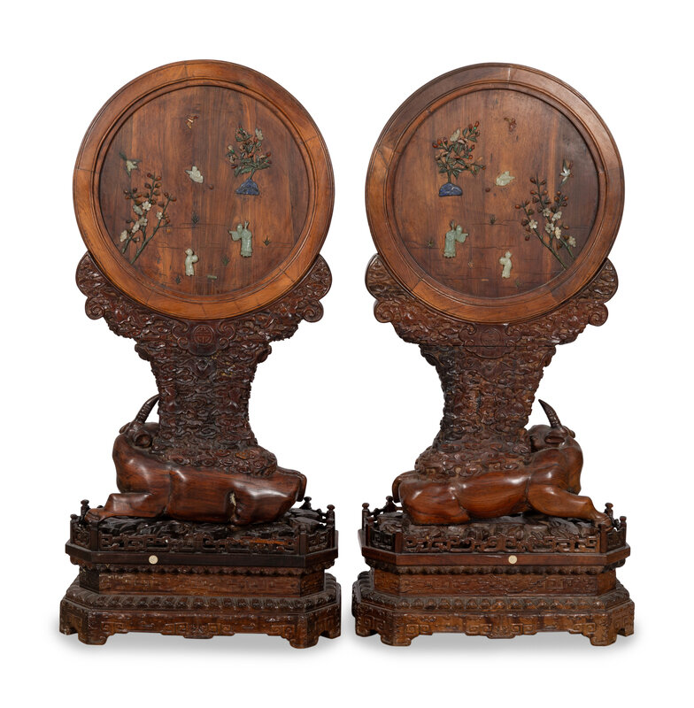 A Pair of Impressive Chinese Hardstone Inlaid Hardwood Floor Screens