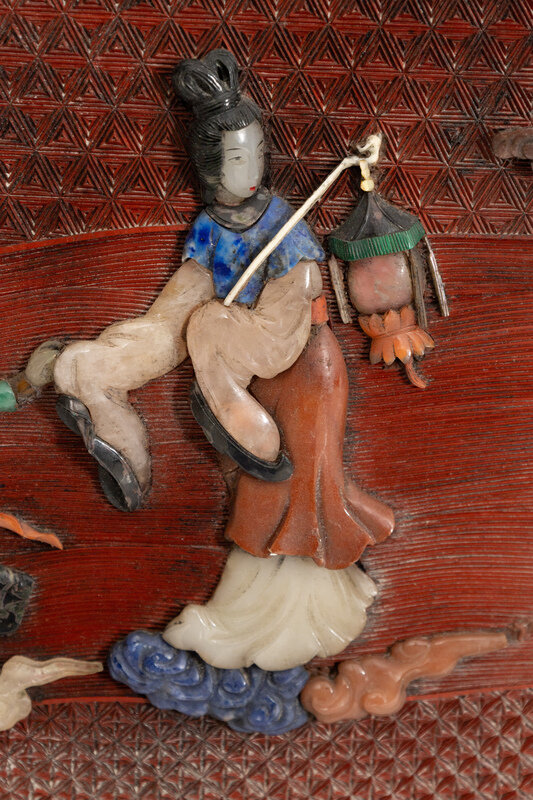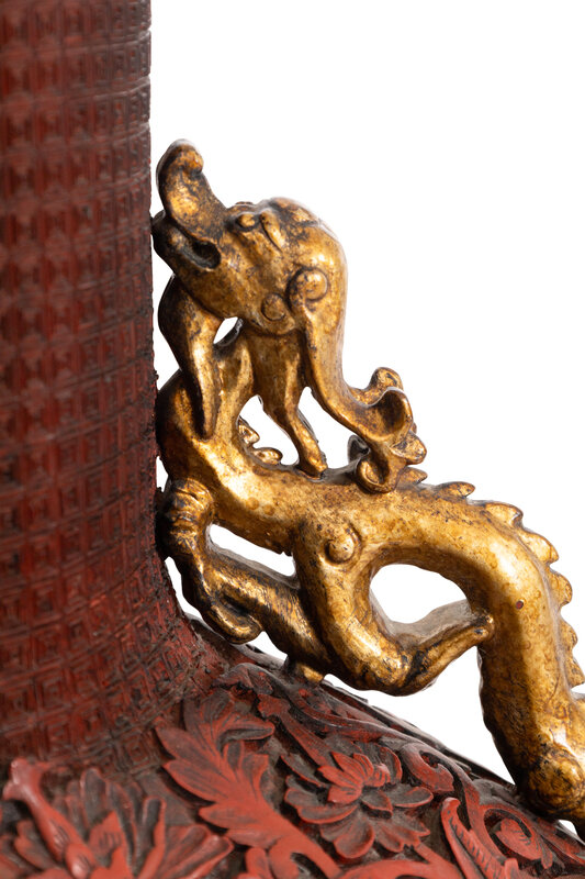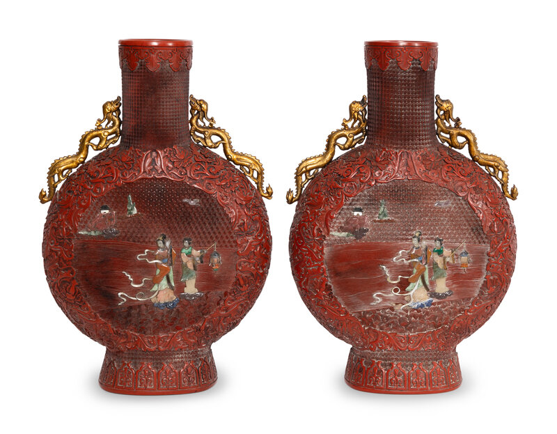 A Pair of Large Chinese Red Lacquer Bottle-Form and Hardstone Applique Vases
