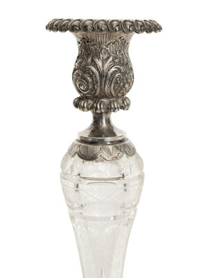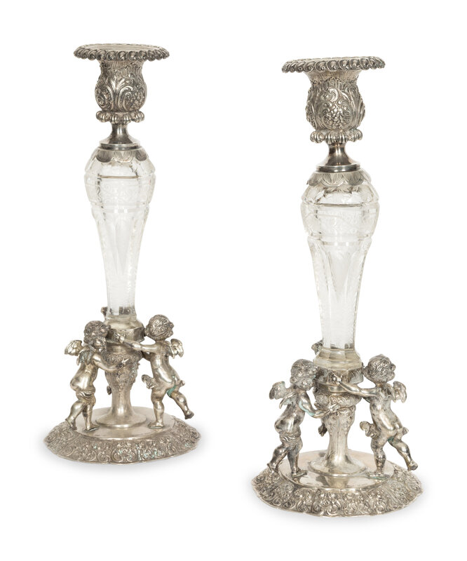 A Pair of German Silver and Cut Glass Figural Candlesticks