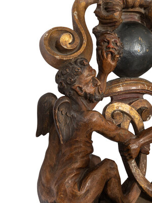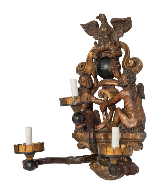 A Venetian Carved Walnut and Cast Iron Polychrome Decorated Three-Light Figural Sconce