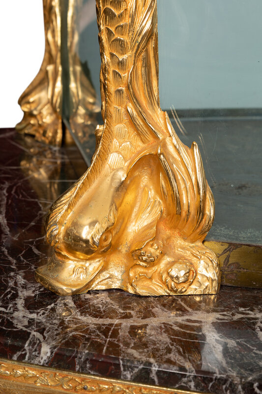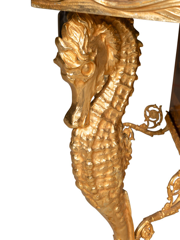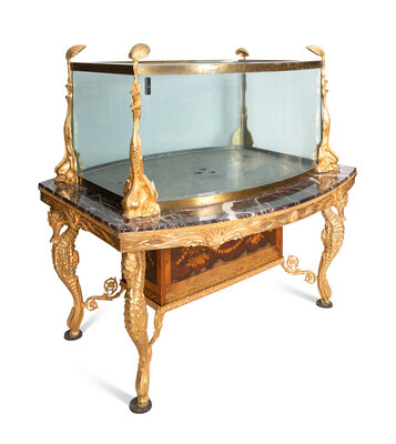 Having an elaborate table-form base composed of gilt seahorse-form legs supporting a lower faux-marquetry wooden case housed below a marble top; the bombe-form glass and steel aquarium mounted in gilt metal and having four dolphin-form mounts at the corners.