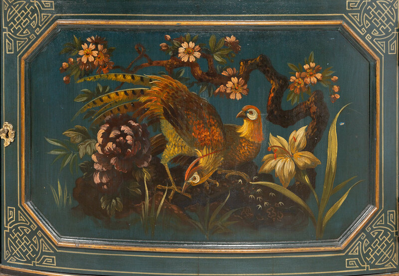 With verde marble tops, the curved central door opens to reveal three tiers of mahogany interior drawers.