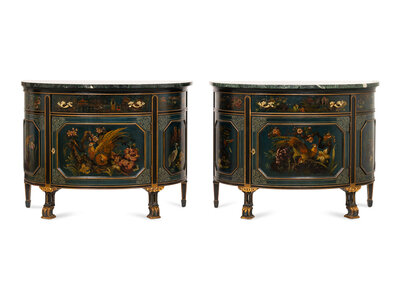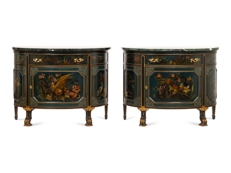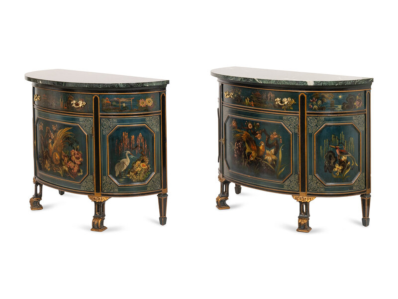 A Pair of Continental Polychrome Decorated Demilune Cabinets