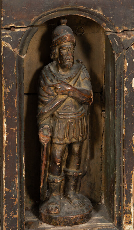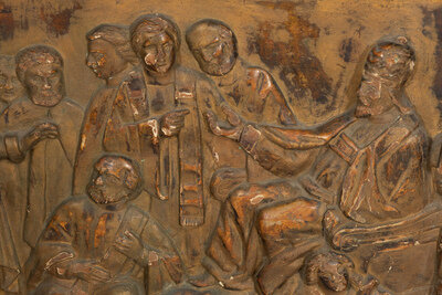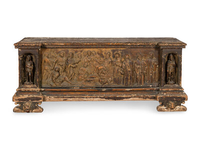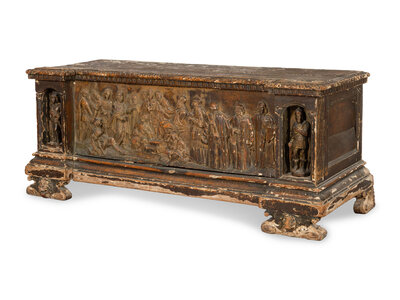 A Continental Baroque Carved Cassone with Carved Relief Panel