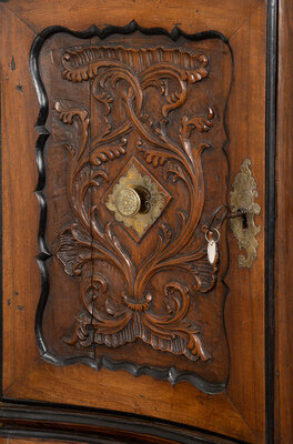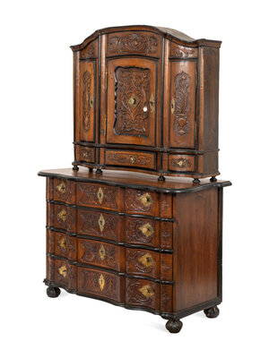 A Portuguese Carved Walnut Parcel Ebonized Bureau Cabinet on Chest