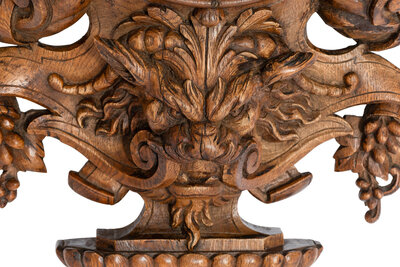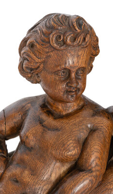 the movement now removed; carved with allegorical putti and mask, the dial having enamel Roman numerals in blue and white, surmounted by a vase-shaped finial terminating in a flame.